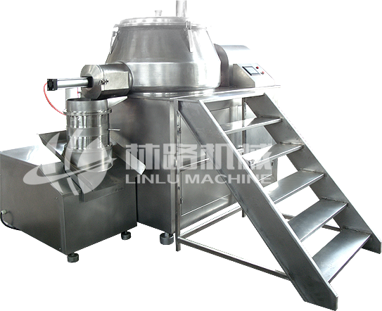 粉体物料与结合剂在圆筒形容器中由底部混合桨充分混合成湿润软材,然后由侧置的高速粉碎桨切割成均匀的湿颗粒。